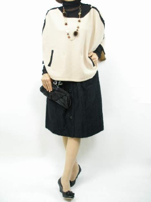 ポンチョは今年の注目アイテムですね。可愛いデザインなのでスカートに合わせて。ママ友とのランチファッションに差をつけて!フェミニン度70%、エレガンス度30%。