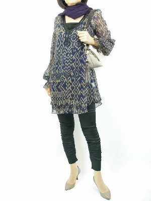 幾何学模様のオシャレなブラウス。中の色のパープルをストールにリンクしてベーシックな中にモードさをプラスして!