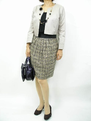 ツイード+ジャケットで上品さあふれるコーディネート。夜のお出かけにキラキラバッグを合わせて!エレガンス度80%、フェミニン度20%。