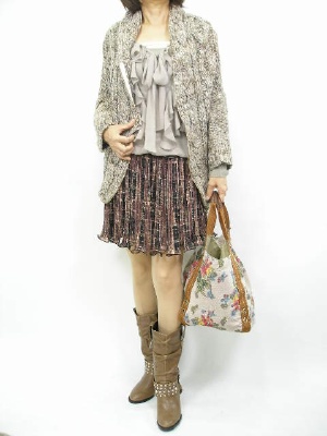 ミックスツイードのたっぷりしたニットを上から羽織る。ミニスカートが裾からチラリと見える大人カワイイアイテム!フェミニン度70%、スタイリッシュ度30%。
