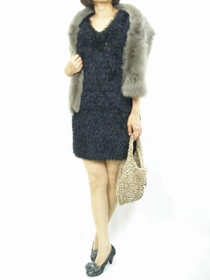 毛足の長い素材のワンピにファーを合わせたゴージャスなコーディネート。デザイン的にはカジュアルなので着こなしやすい!エレガンス度80%、スタイリッシュ度20%。