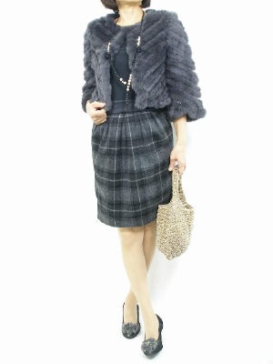タックスカートにはショートジャケットがベストバランス。ニットがついたワンピースタイプなのでもたつかずスッキリ!エレガンス度100%。