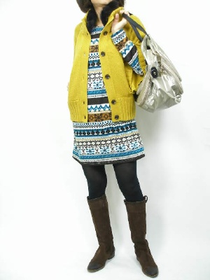 この冬流行りのノルディック柄をカットソーワンピで取り入れて!アクティブ度70%、フェミニン度30%。