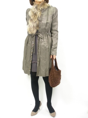 カジュアルなカットソーワンピに艶のあるコートを。カジュアルとエレガンスのMIXがオシャレです!エレガンス度60%、スタイリッシュ度40%。