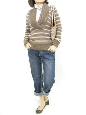 ボーダーニットとデニムのボーイッシュな着こなし。きらりと光るラメやスパンコールで華やかさをプラスして!アクティブ度90%、スタイリッシュ度10%。