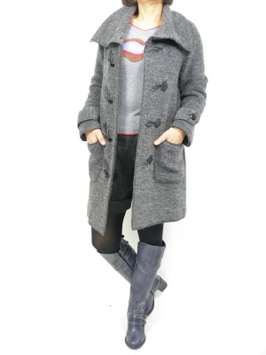 ダッフルコート+ショートパンツでも色を押さえれば大人の雰囲気に。ハートがキュートですね!アクティブ度90%、フェミニン度10%。
