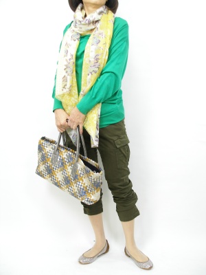 キャミ付きドルマン型ニット。グリーンの色がオシャレですね。カジュアルもやっぱり流行りを取り入れてコントラストの効いた黄色系のストールで春らしく!アクティブ度90%、スタイリッシュ度10%。