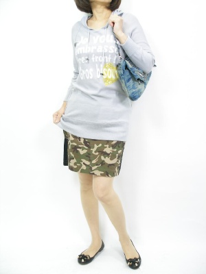 スカートの切り替えがより細く見せてくれるポイント。トップスを長めにして大人のカジュアルです!アクティブ度90%、フェミニン度10%。