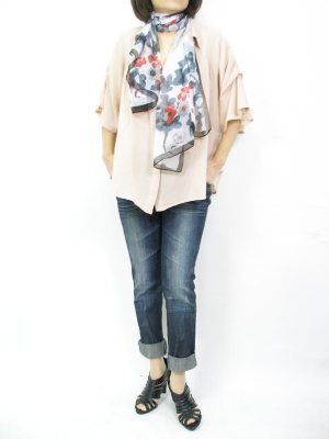 たっぷりシャツブラウスはデニムで抜け感を出すのが大人の着崩しですね。人気復活のスカーフで華やかさをプラス!アクティブ度70%、フェミニン度30%。