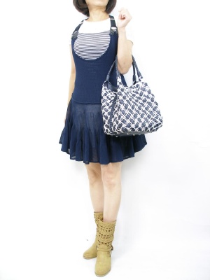 ニットのジャンスカはスカート部分がフレアーでとても可愛い。紺×白のコントラストにブーツのキャメル色をプラス。チョコカワなオシャレを楽しんで下さいね!フェミニン度70%、アクティブ度30%。