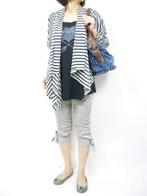 変形カーディは動くたび色々な表情で楽しみが増してきます。デニムバッグが全体のファッションに良く合いますね!アクティブ度80%、スタイリッシュ度20%。