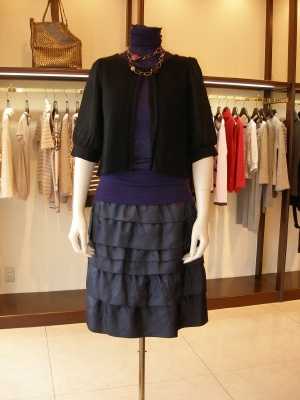 ネイビーのティアードスカート。流行のパープルのノースリーブニットと組み合わせ。裾がシフォンのカーデェはエレガントの代表ですね!