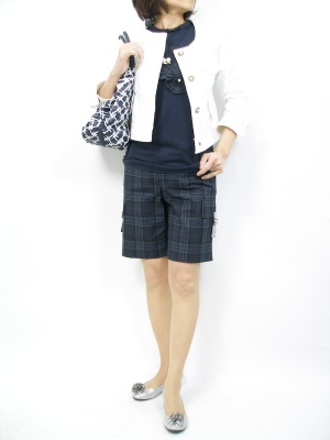 ハーフパンツはジャケットを羽織ると意外にきちんと感がでます。シックな色使いで少年ぽくないコーディネートを!フェミニン度60%、スタイリッシュ度40%。