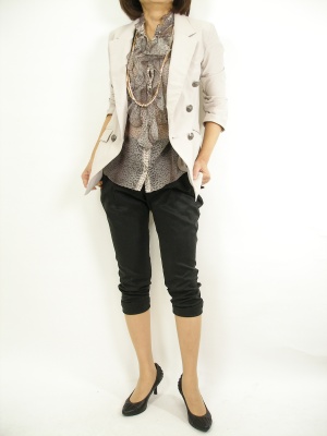 ジャケット+パンツのハンサムコーディに優雅なブラウスで女性度UP。柔らかさがプラスされますね!スタイリッシュ度90%、エレガンス度10%。