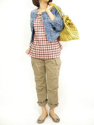 ビシュー付きブラウスをちょっと辛口にコーディネート。変形デニムジャケットと好相性です!アクティブ度100%。