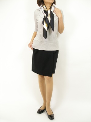 シャープなモノトーンの組合せ。スカーフの柄で全体がオシャレな仕上がりになります。ジャージのスカートも動きやすくスッキリ見せてくれます!スタイリッシュ度90%、エレガンス度10%。