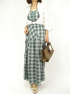 マキシワンピはシャツ合わせでリゾート気分満点なコーディ。足元はウエッジソールで足長に決めて!アクティブ度70%、フェミニン度30%。