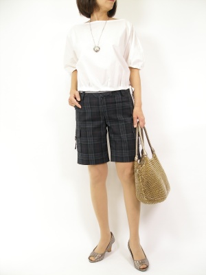 ふんわりしたブラウスは上品でありつつカジュアルな装いにもなりますね。ショートパンツでより一層カジュアルフェミニンスタイルに!フェミニン度70%、アクティブ度30%。