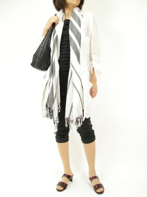 モノトーンは一見淋しい合わせ方になりますが、ストールのバランスとバッグの大きさでシンプルでお洒落な合わせ方になりますね!スタイリッシュ度1005.
