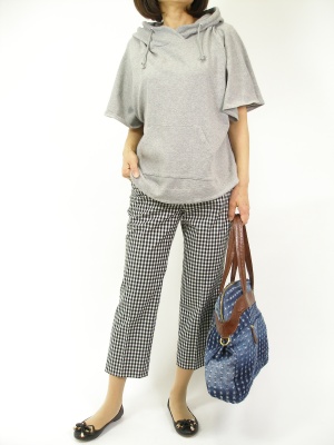 ゆったりパーカをセンタープレスパンツで大人カジュアルに仕上げました。休日のお買いものに楽チンスタイルです!アクティブ度90%、スタイリッシュ度10%。