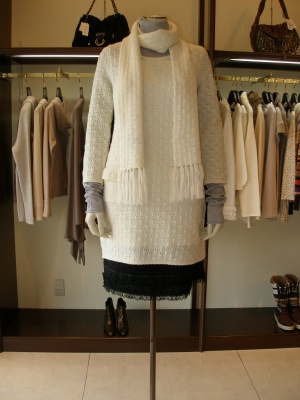 ニットワンピースは、この季節少しづつ厚手になってきました。ストール付きもうれしいですね。タイツとブーツでオシャレに!フェミニン度90%スタイリッシュ度10%。