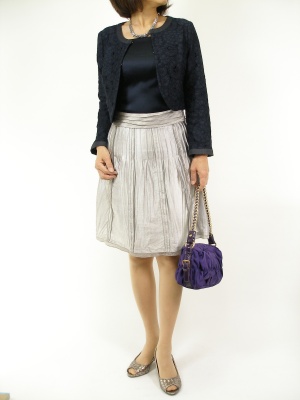 光沢の有るスカートはジャケット合わせで、かしこまった席にも対応できます。足元はあえてヌーディーな色目で上品に!エレガンス度90%、フェミニン度10%。