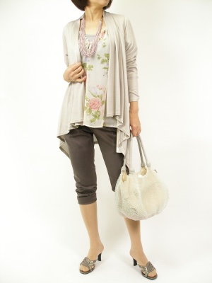 フェミニンブラウスを辛口にコーディネート。グレイッシュにまとめると軽やかになります!スタイリッシュ度90%、フェミニン度10%。