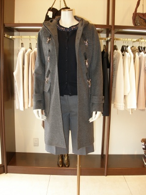 非ウールコートが多い中、ウールコートも目立ち始めまたこの頃。通勤には欠かせませんね。インナーのニットはとてもシンプルワインニットで!スタイリッシュ度80%、フェミニン度20%。