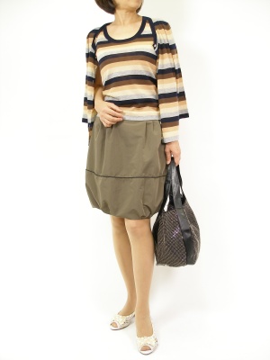 バルーンスカートをアースカラーでまとめました。全体的に落ち着いた印象に!フェミニン度90%、エレガンス度10%。