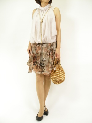 個性的なプリントボトムスには、上品カットソーでワンランク上の着こなしに!エレガンス度80%、スタイリッシュ度20%。
