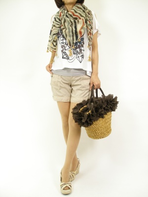 今年のゆるトップスは肩のラインも凝っています。アニマルストールとショートパンツで軽快さと抜け感を演出!アクティブ度90%、スタイリッシュ度10%。