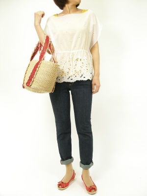 レースブラウスをクシュクシュデニムでフェミニンカジュアルに!アクティブ度80%、フェミニン度20%。