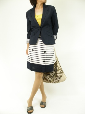 紺ブレと紺×白のスカートで清涼感を出して・・。インナーの黄色でメリハリをつけてみました。仕事やちょっとした学校行事に着たいコーディネート!スタイリッシュ度90%、エレガンス度10%。