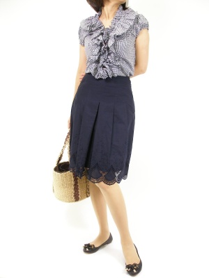 フリルブラウスはネイビースカートで甘さを引き締めて大人フェミニンに。学校行事にも使って頂けます、キチンとスタイルです!フェミニン度80%、アクティブ度20%。