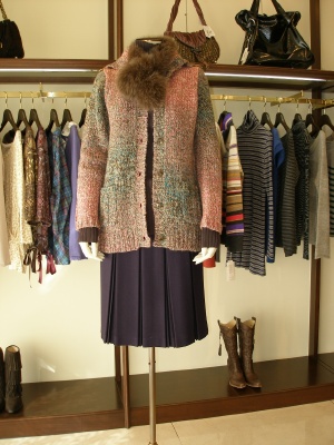 ミックスツイードのロングカーディ・・。見ているだけで暖かなシルエット。スカートのパープルとゴールドのブーティの間は濃いめのタイツで繋げて!フェミニン度80%、スタイリッシュ度20%。
