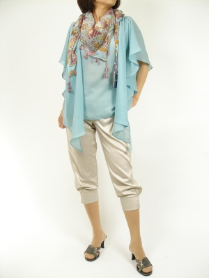 お袖のラインが特徴的なブラウスは、サルエルパンツのボリュームとも合いますね。綺麗色のストールでポイントを上に持ってきました!スタイリッシュ度80%、フェミニン度20%。