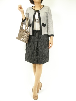 薄手のジャケットは黒のライン取りが効いています。バルーンスカートの素材感がリッチ差をUP!エレガンス度90%、フェミニン度10%。