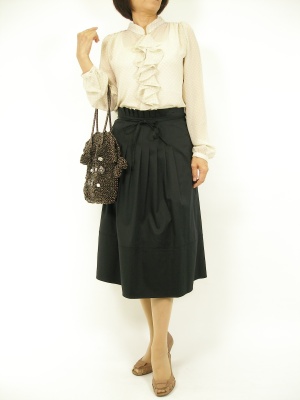 久々登場の長めのスカートは、甘いブラウスを合わせるとキチンとした印象になりますね。スカートのボリューム感とふんわりお袖が好バランスですね!フェミニン度80%、エレガンス度20%。