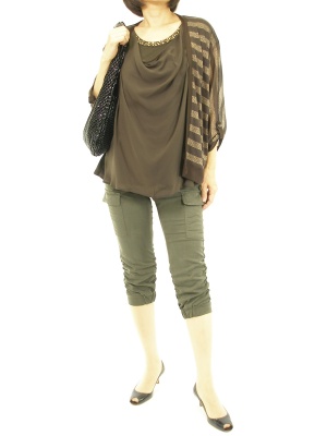 胸元のドレープを活かしたレイヤードスタイル。カーゴパンツで少し抜け感を出してみました!スタイリッシュ度90%、エレガンス度10%。