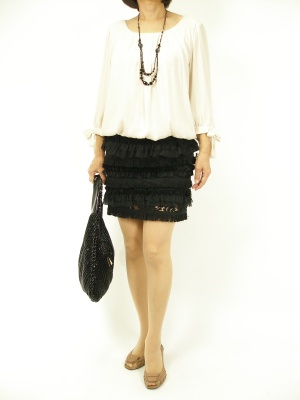 レース使いが女性らしいスカートは、キレイ目ブラウスを合わせたい。モノトーンでスカートの甘さを抑えます!エレガンス度70%、フェミニン度30%。
