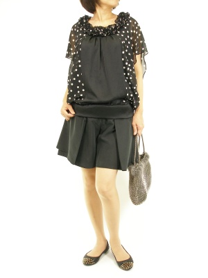 フリルやドットもシフォン素材なら軽やかに決まります。座っても華やかなのでお食事の時も人目を引くコーディです!フェミニン度90%、アクティブ度10%。