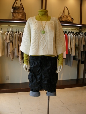 ポンチョのようなニットカーデェとややスポーティなスカートでスイートカジュアルに!