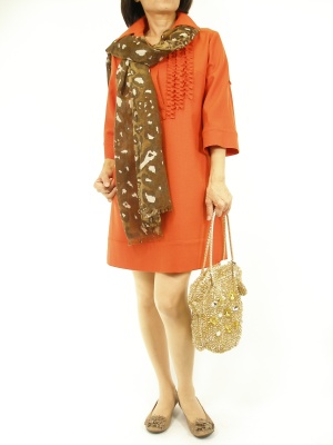 オレンジ色が鮮やかなサックワンピは黒で引き締めれば大人モードに。抑えたフリルがポイントです!エレガンス度70%、フェミニン度30%。
