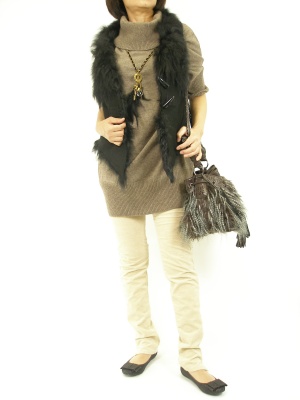 ムーントンベストをナチュラルに見せてくれるコクーンニットワンピは優しいシルエット。今年はコーディロイ合わせでコンフォートスタイルです!スタイリッシュ度70%、アクティブ度30%。