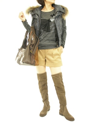 ショート丈が軽快なダウンベストはショートパンツでアクティブカジュアルに。ボーダーは大人っぽく濃い目を合わせます!アクティブ度90%、フェミニン度10%。