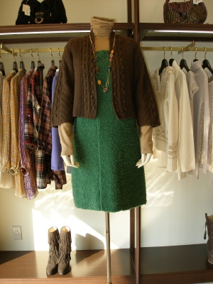 モコモコしたニットワンピースは、色がお洒落です。ニットを重ねてカーディと合わせればちょっとお出かけに!フェミニン度80%、アクティブ度20%。