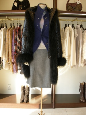 大きなボタンが特徴のカーディガン。全部閉じてもOK。グレーのスカートで上品に・・。ロングのダウンコートで通勤にも最適!スタイリッシュ度90%、フェミニン度10%。