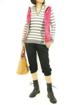 コンパクトな薄手ダウンはこれからも活躍するアイテム。モノトーンカーディのアクセントをピンクでチョイス!アクティブ度80%、スタイリッシュ度20%。