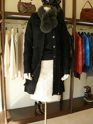 ニットコートはそれだけでもワンピースのようなシルエットになり、エレガントです。インナーのニットもビーズ刺繍もお洒落度アップさせますね!エレガンス度80%、フェミニン度20%。