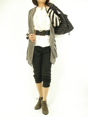 白×黒のコントラストの効いたカーディは甘口のブラウスで女性らしをプラスして。ボトムスはティーパードパンツでシャープにまとめました!スタイリッシュ度90%、フェミニン度10%。